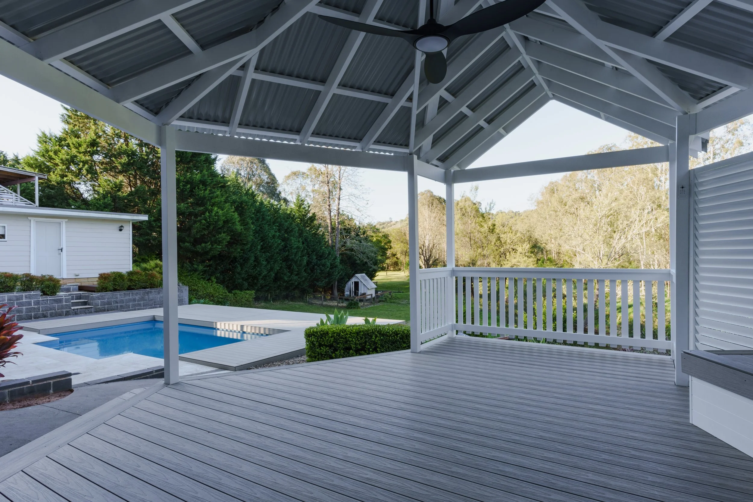 We then moved on to a huge refresh of their pool and outdoor entertainment spaces, adding a huge Ekodeck to surround the pool with a stylishly designed bench seat with backrest to match. The accompanying pool cabana was also completely rebuilt to tie the whole space together and create the perfect summer oasis!